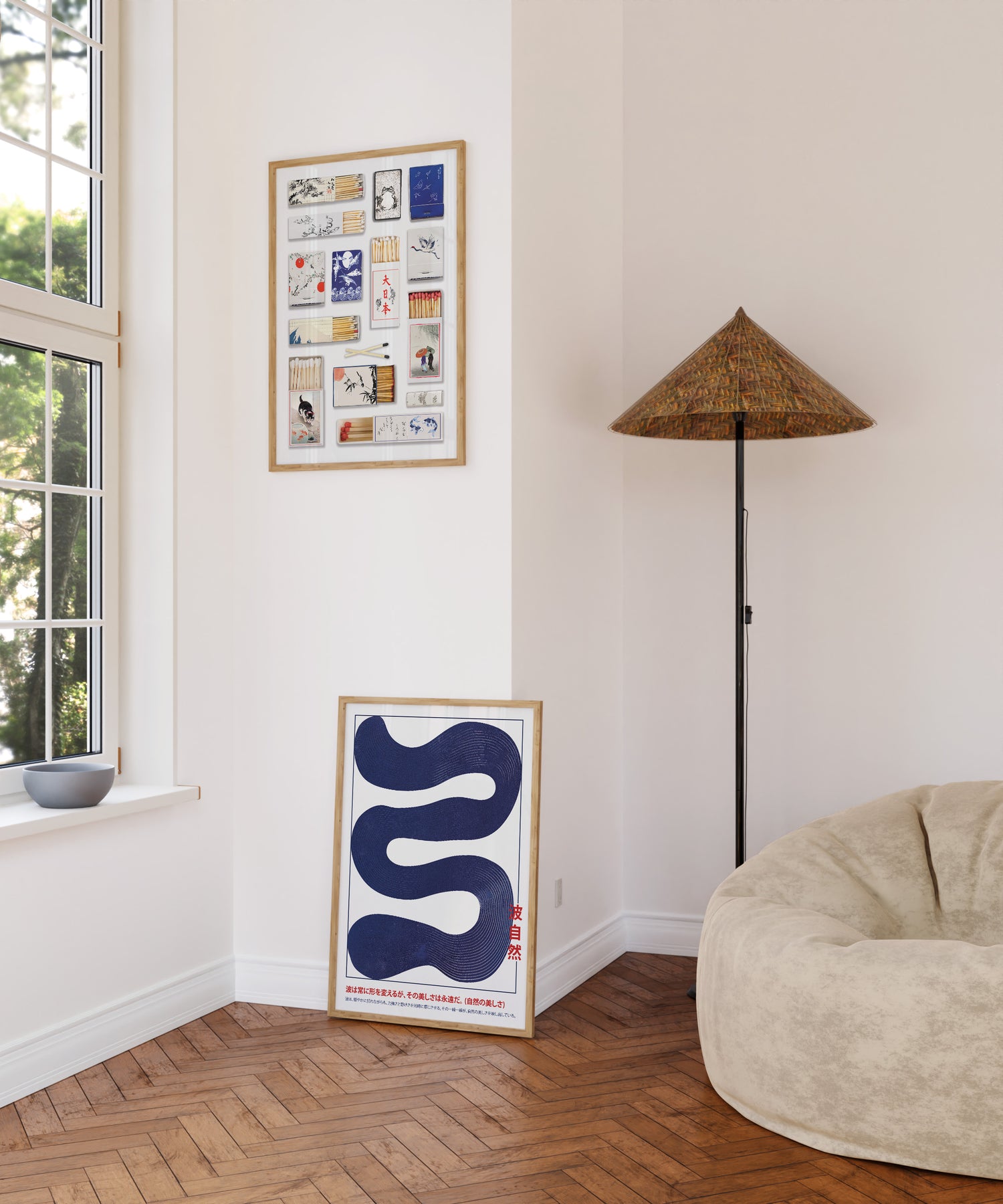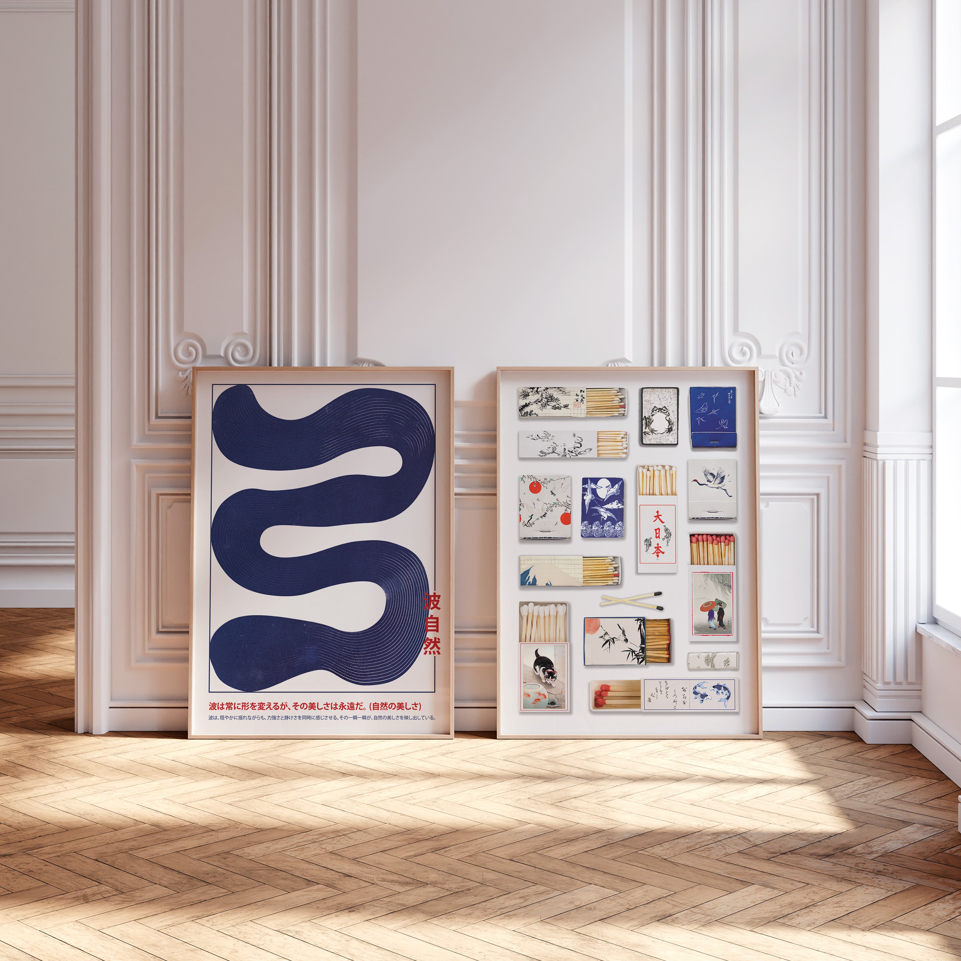 Together, the two prints form a cultural and visual conversation: the wave as a timeless metaphor for continuity and endurance, and the matchbox labels as fleeting moments of crafted narrative. Displayed side by side, they celebrate the harmony between permanence and ephemera, tradition and abstraction—making them perfect for interiors that value both story and serenity.