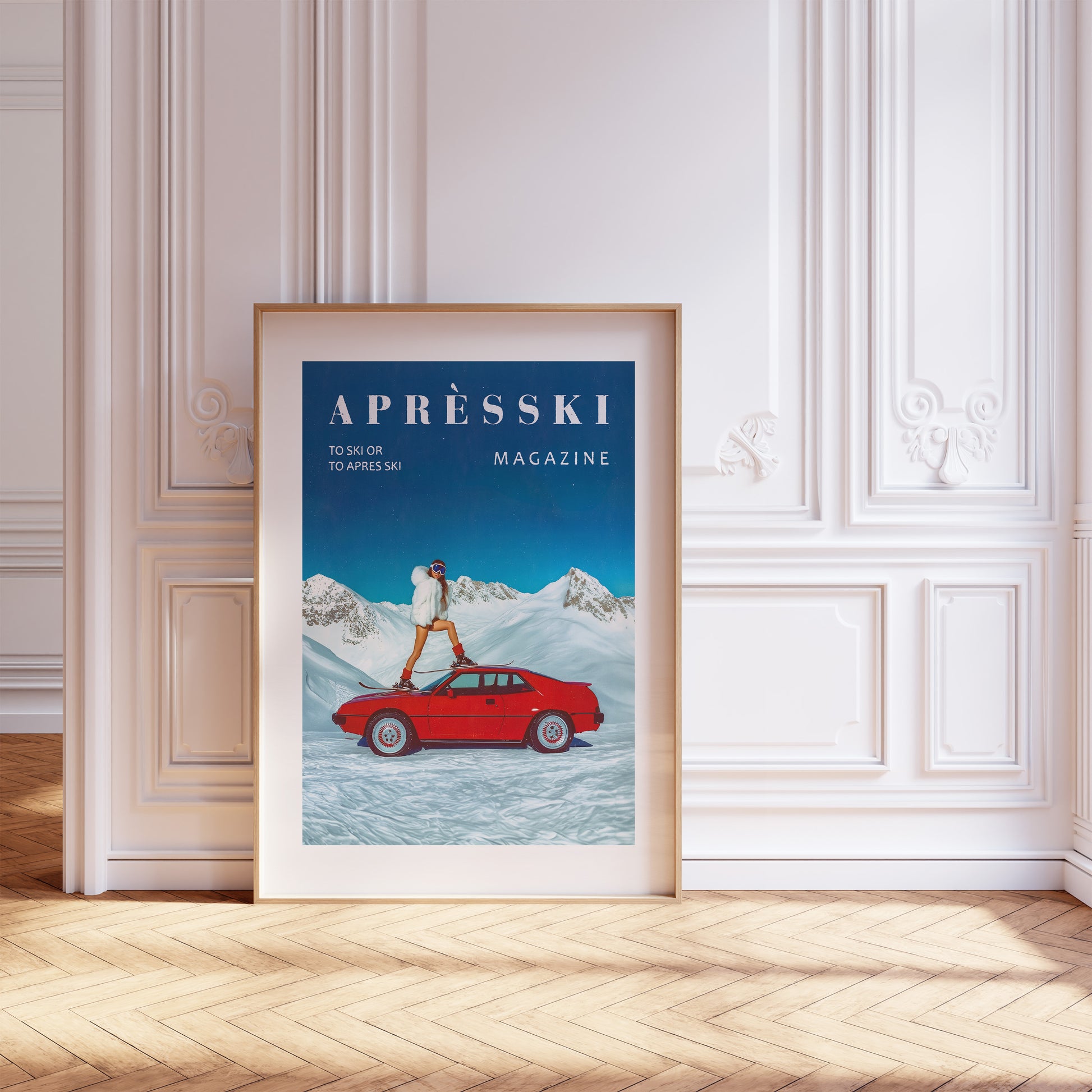Poster featuring a vintage Après-Ski Fashion Magazine Cover, accompanied by smaller text elements. Made in blue, red and white colors.
