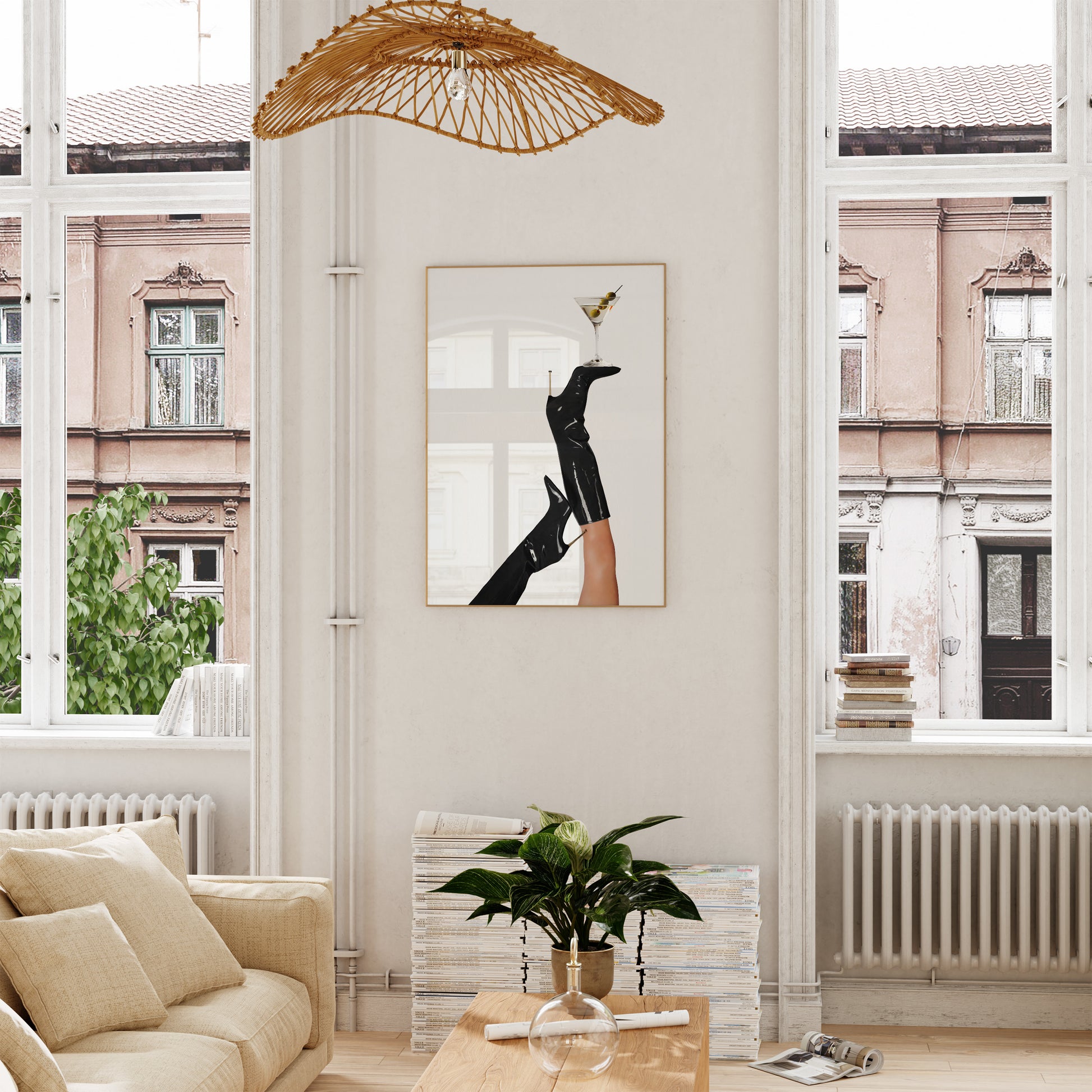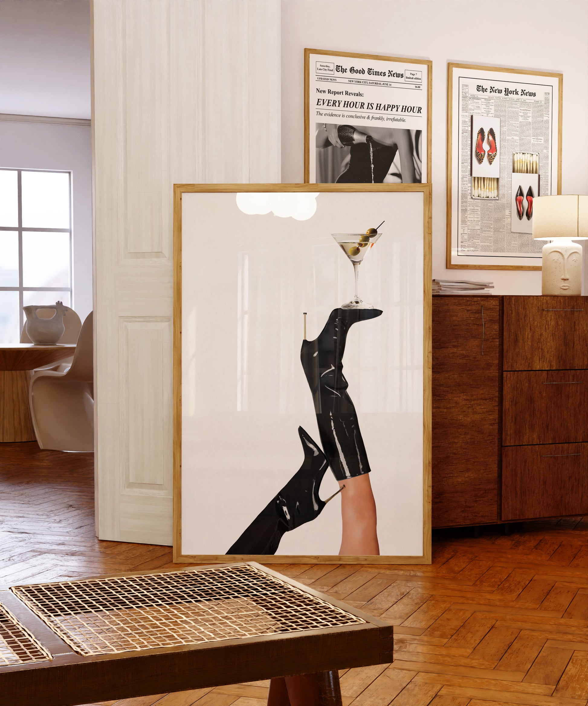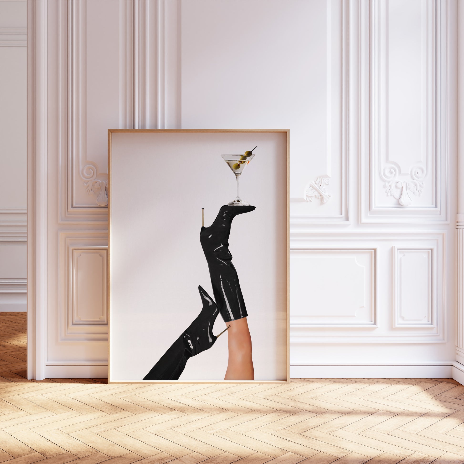 Poster featuring a pair of retro black boots with a dirty martini on top, in the style of a vintage fashion magazine cover. Made in green, beige, black and white colors.