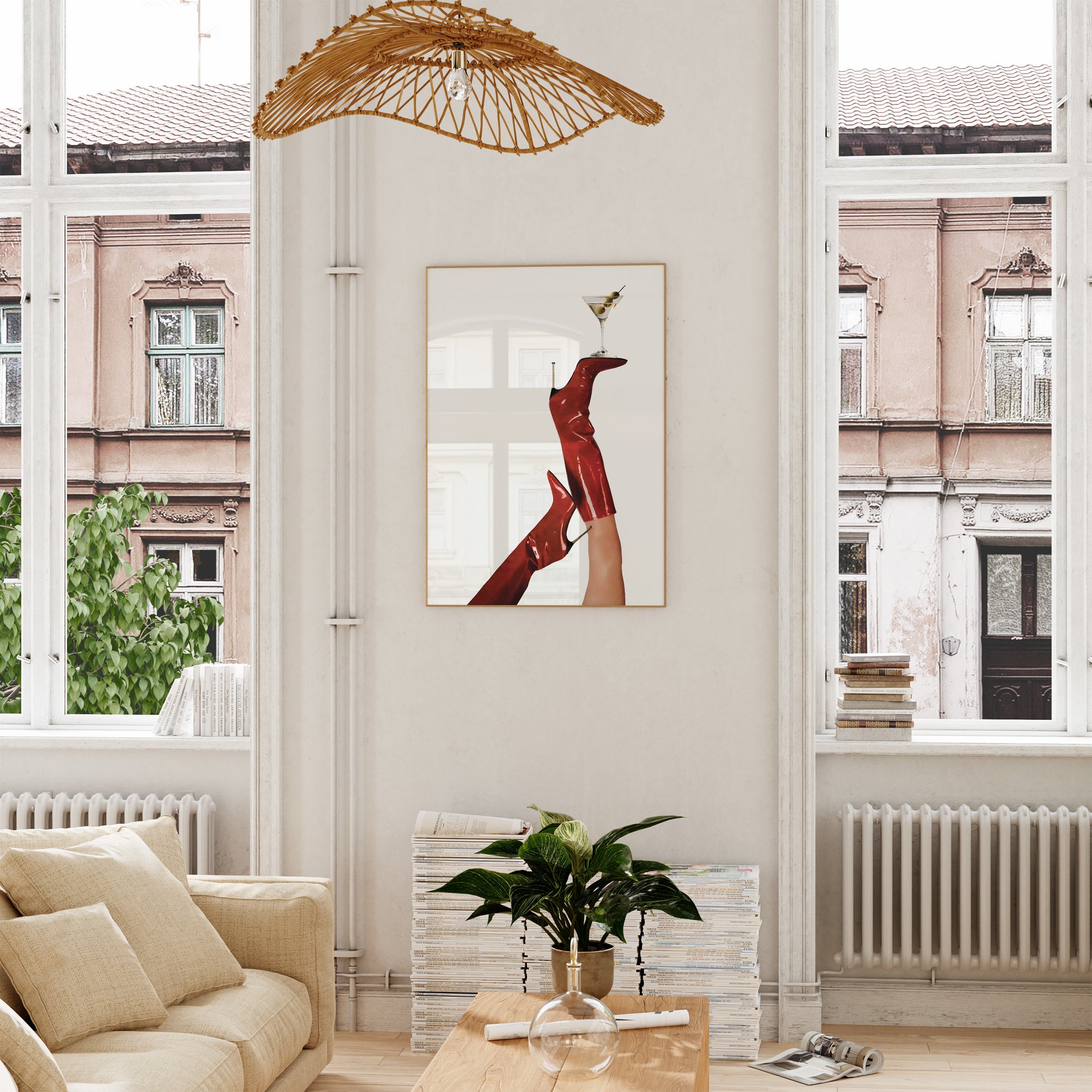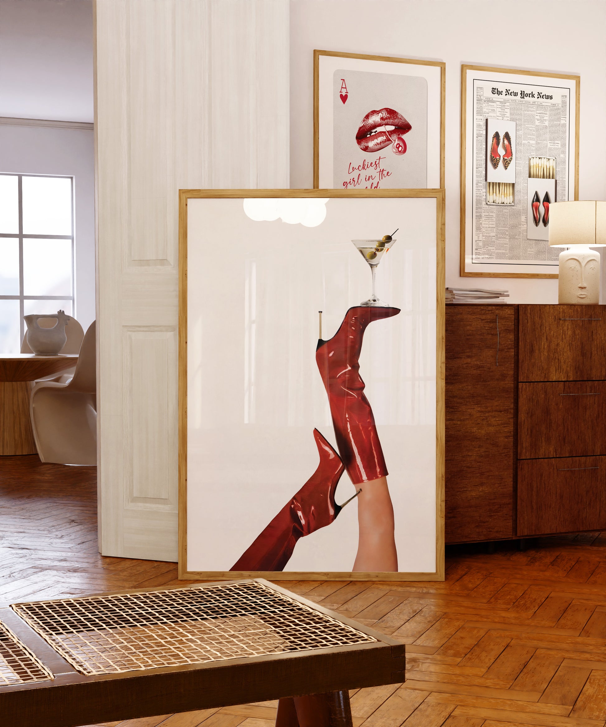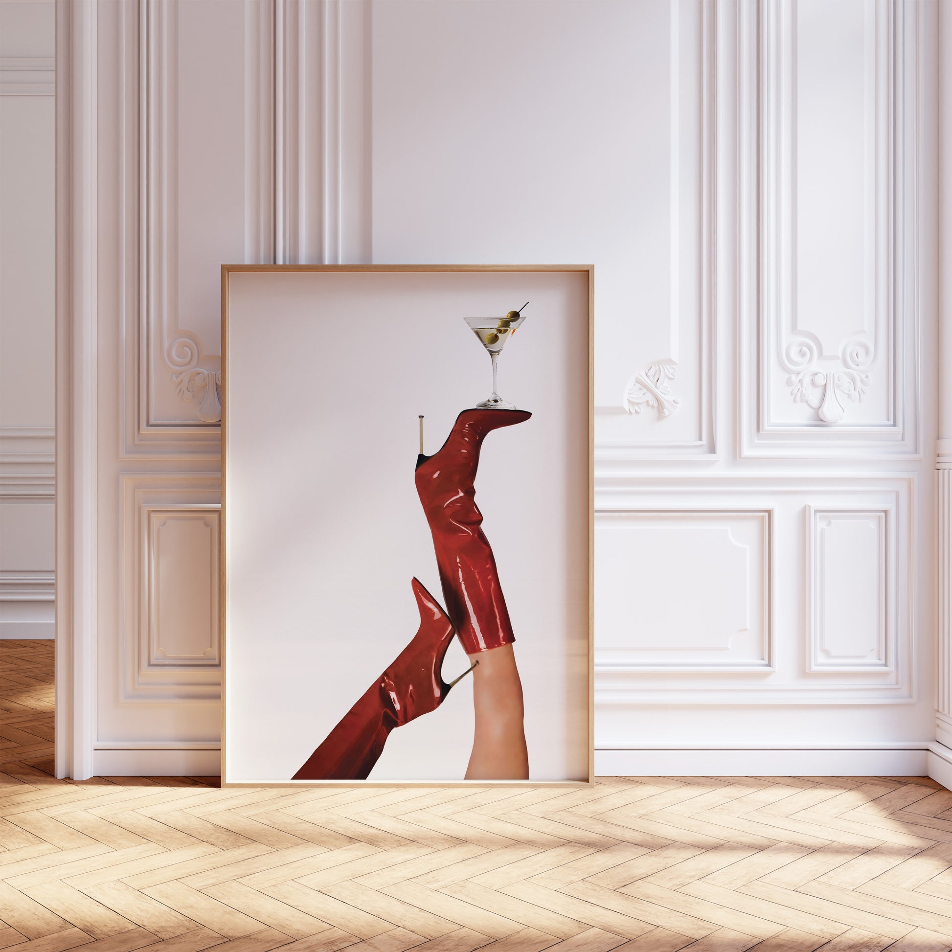 Poster featuring a pair of retro red boots with a dirty martini on top, in the style of a vintage fashion magazine cover. Made in red, green, black and white colors.