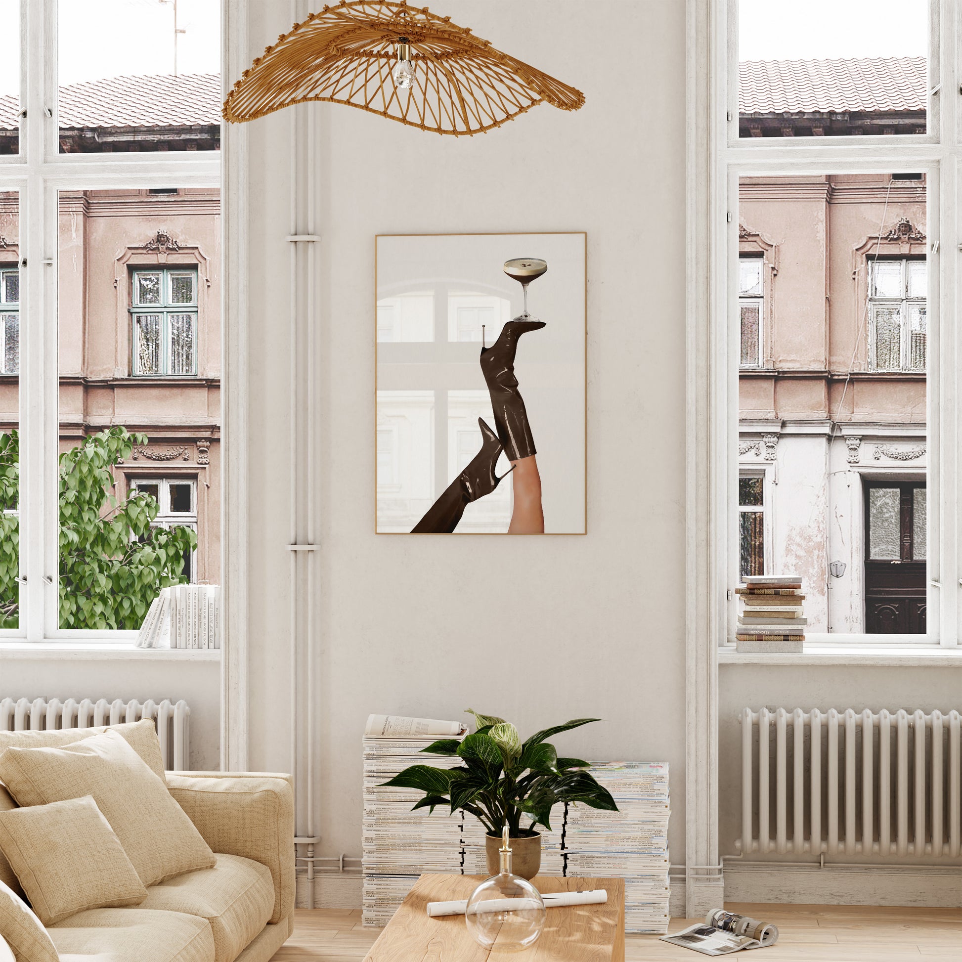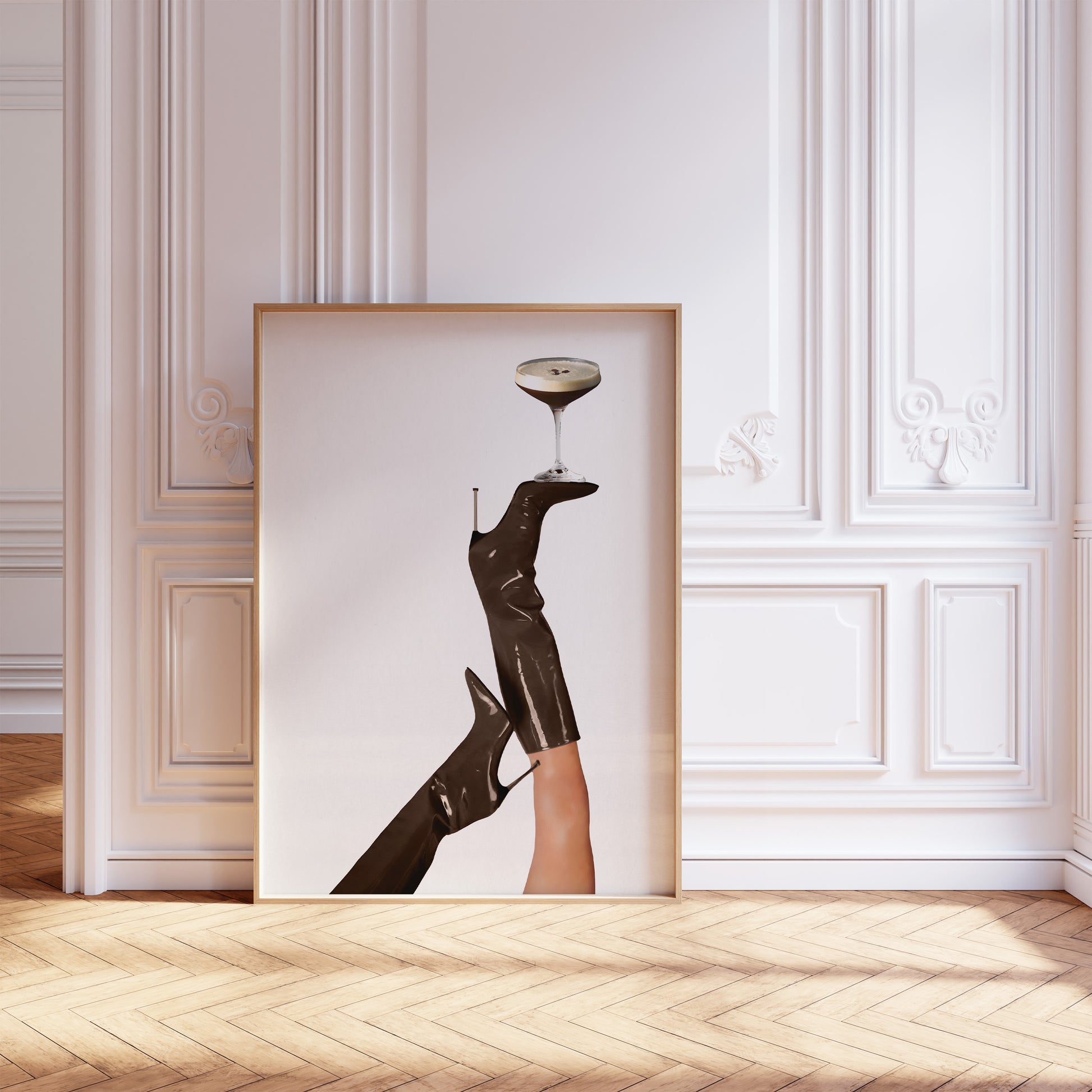 Poster featuring a pair of retro red boots with an espresso martini on top, in the style of a vintage fashion magazine cover. Made in brown, beige, black and white colors.