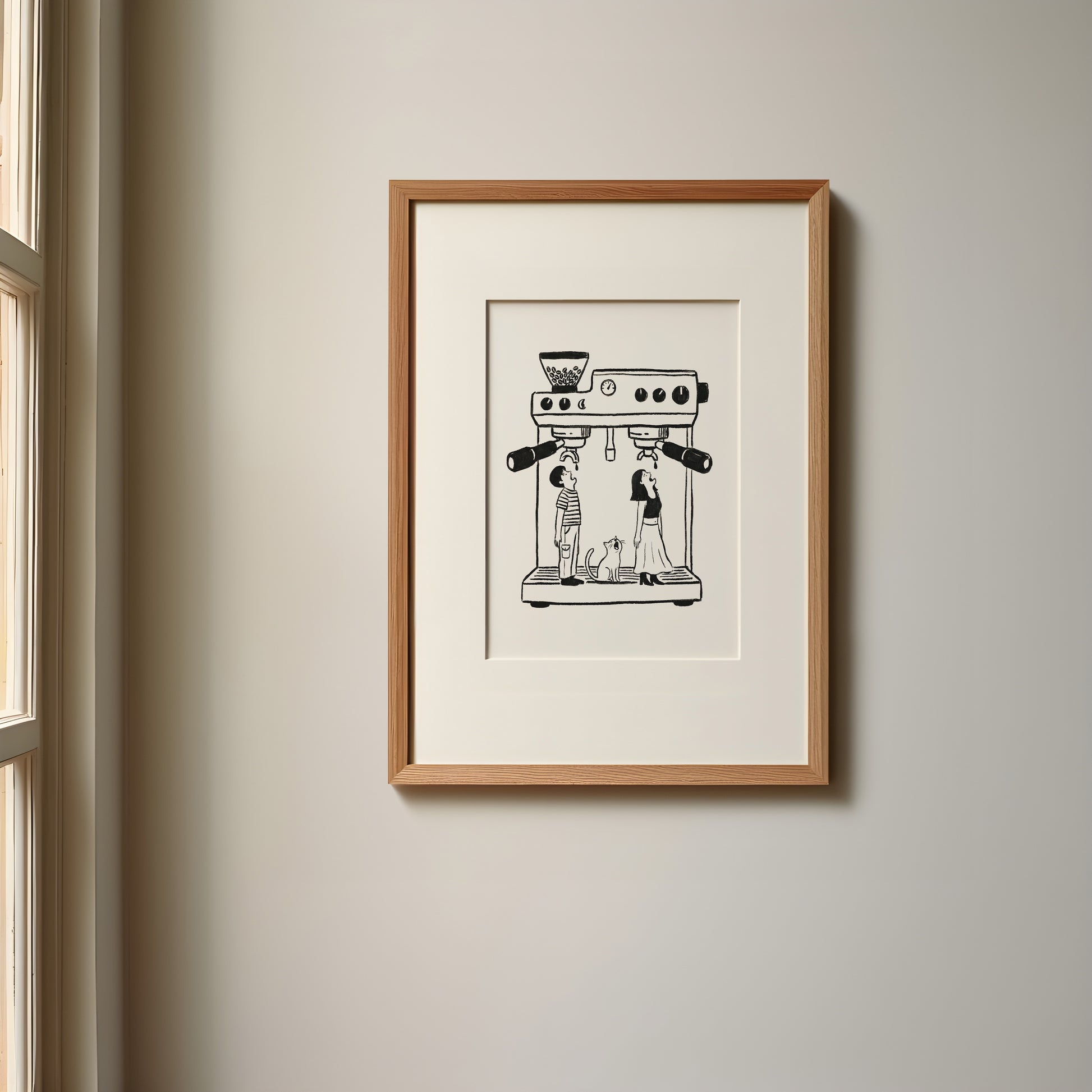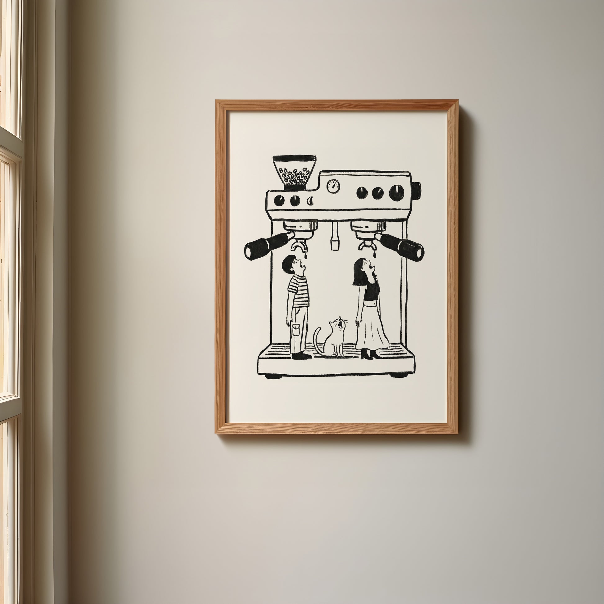 A monochrome hand-drawn minimalist poster design featuring a man, a woman and a cat waiting for their daily drip of coffee. Made in black and white colors.