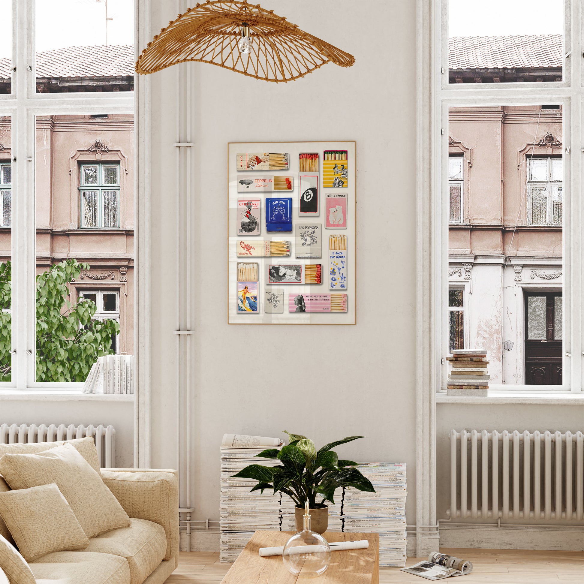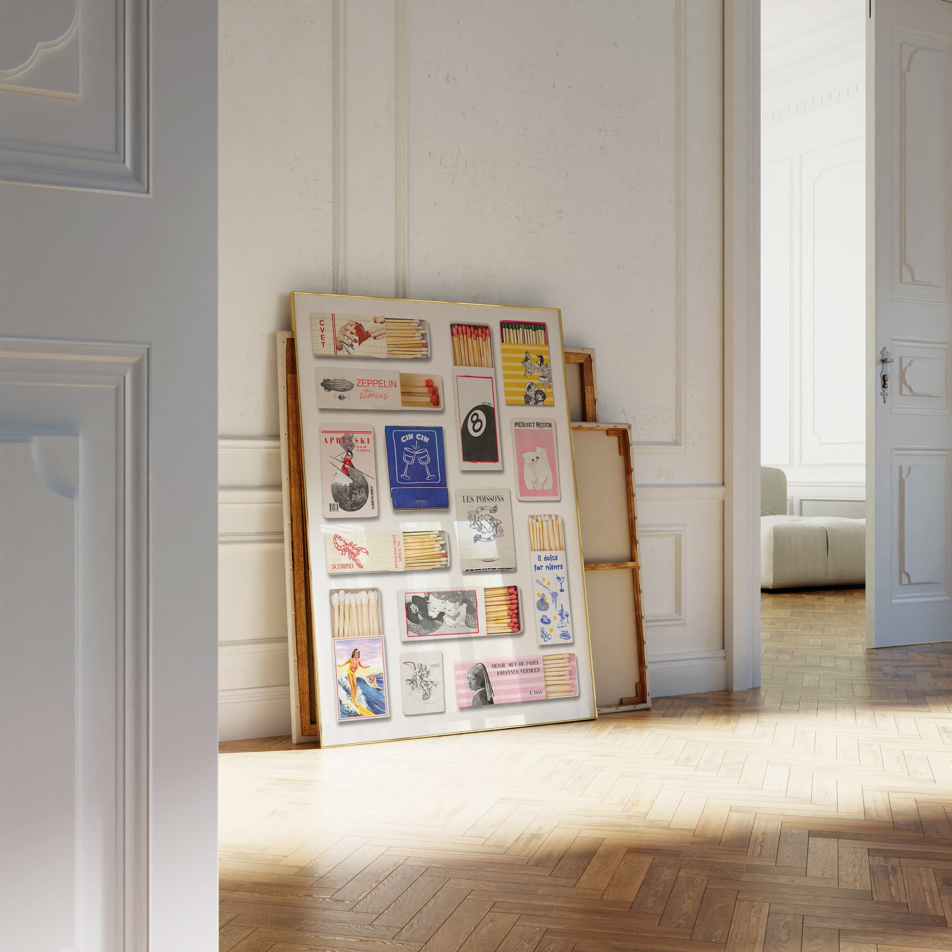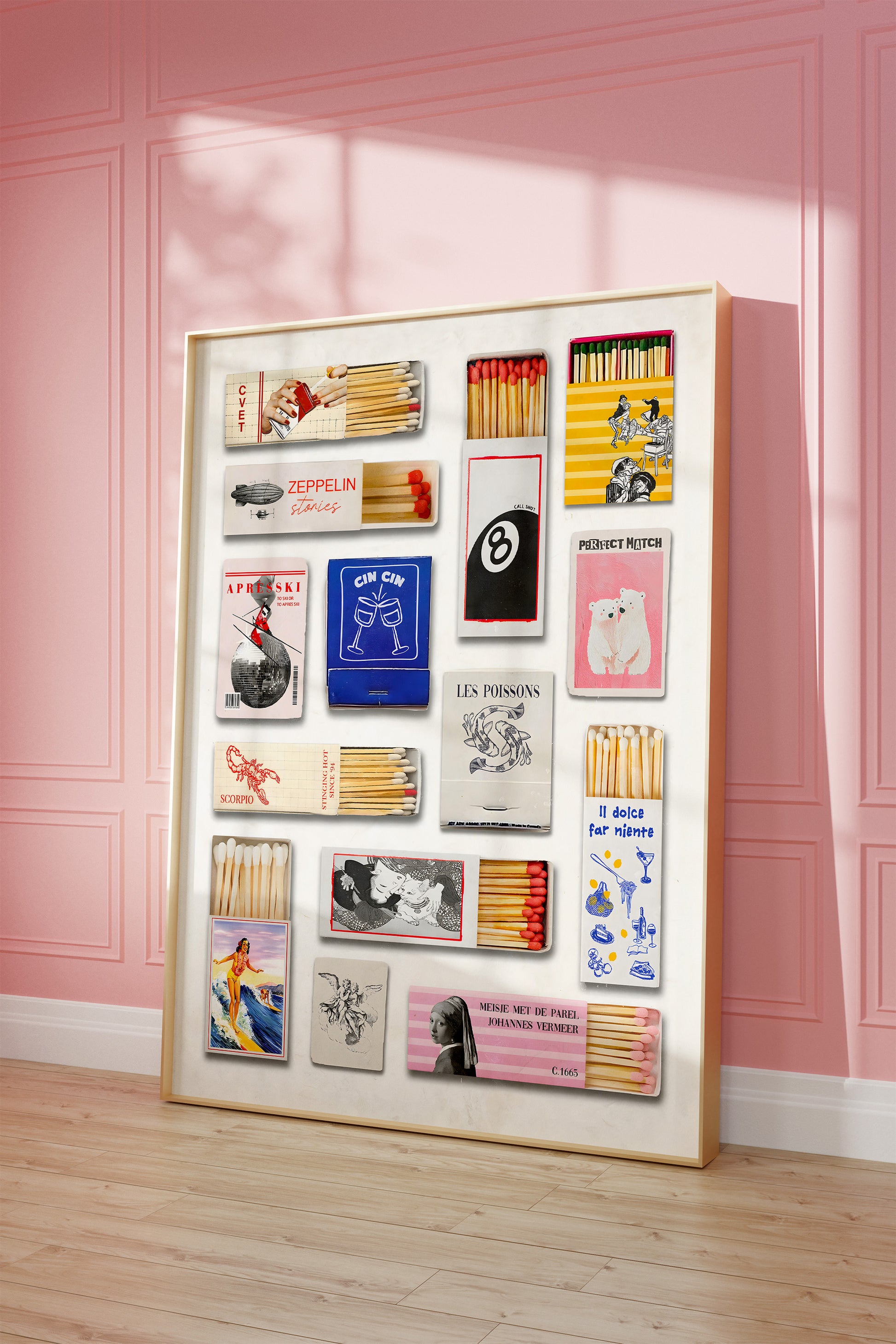 Poster featuring a matchbox collection, accompanied by smaller text elements. Made blue, red, pink, yellow, grey, black, white and beige colors.
