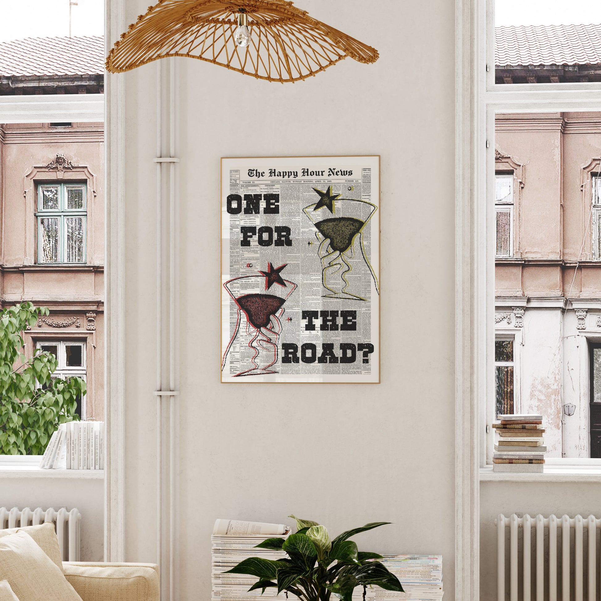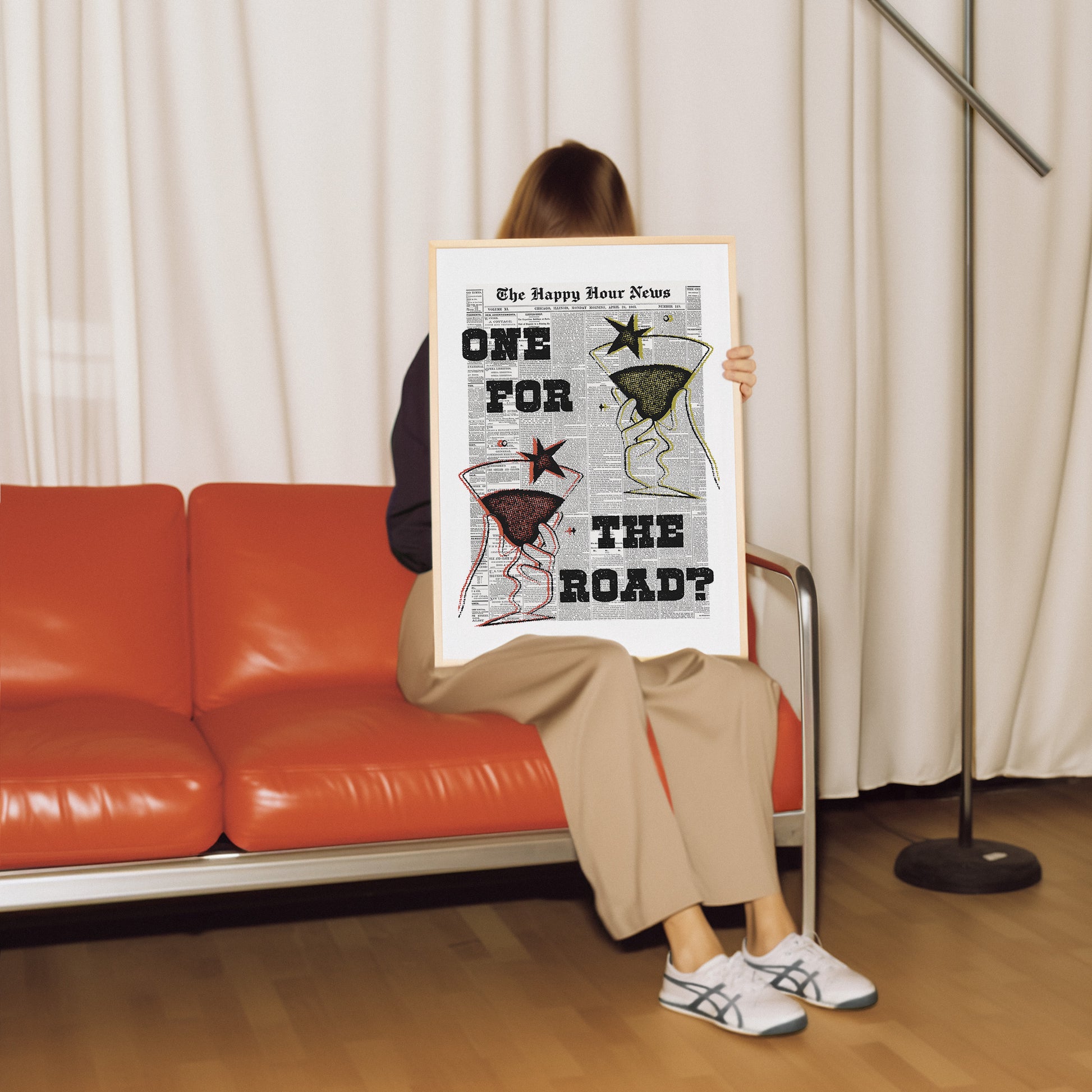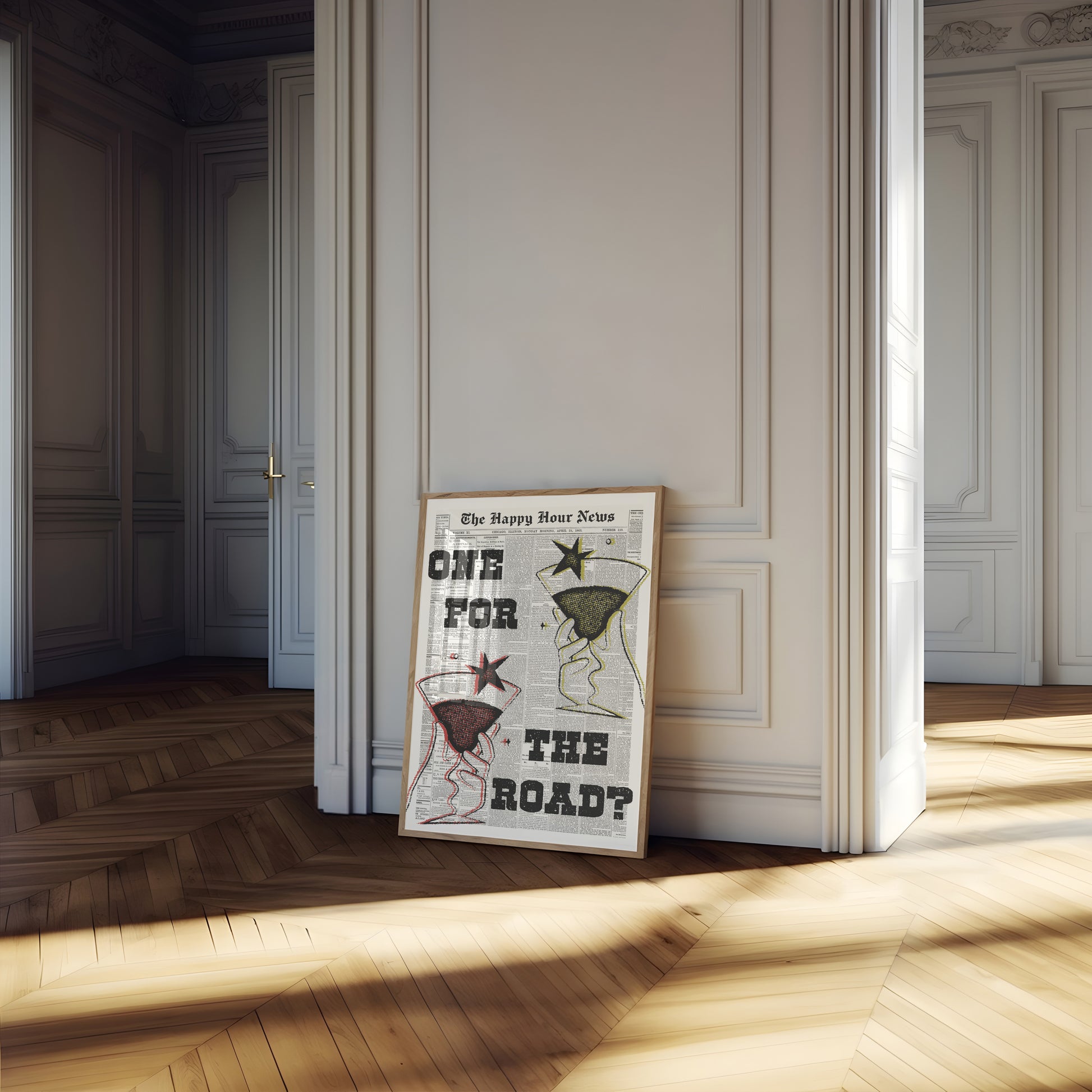 Poster featuring two hand-drawn sketch style glasses, on a vintage newspaper accompanied by smaller text elements. Made in black, red, green, gray and white colors.