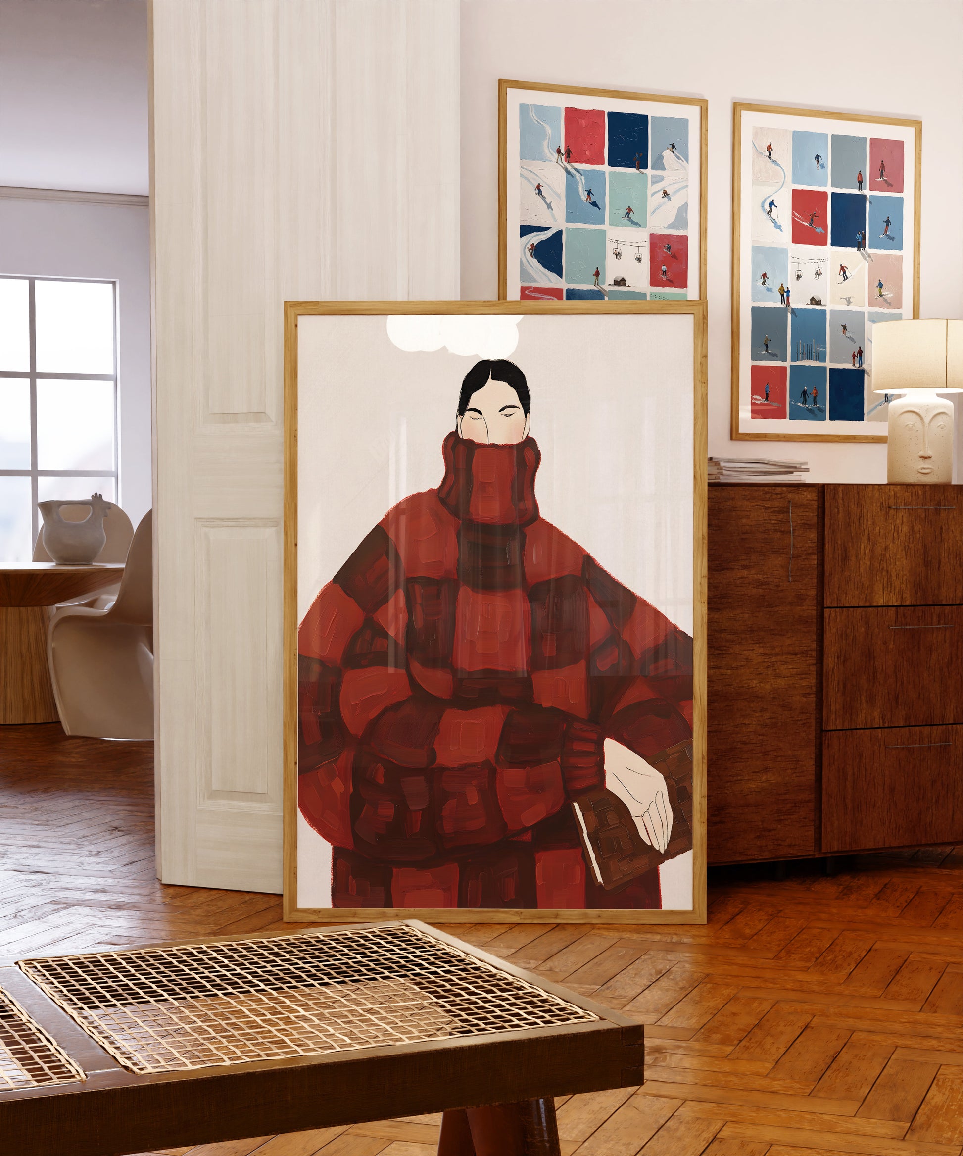 This print features a stylized female figure wrapped in a voluminous red checkered sweater, rendered with bold brushstrokes and minimal facial detail. The modern, minimalist design combines fashion illustration with painterly texture, creating a balance between abstraction and elegance. Warm tones of deep red and brown contrast against a clean white background, giving the piece a mid-century, contemporary feel that suits modern interiors.
