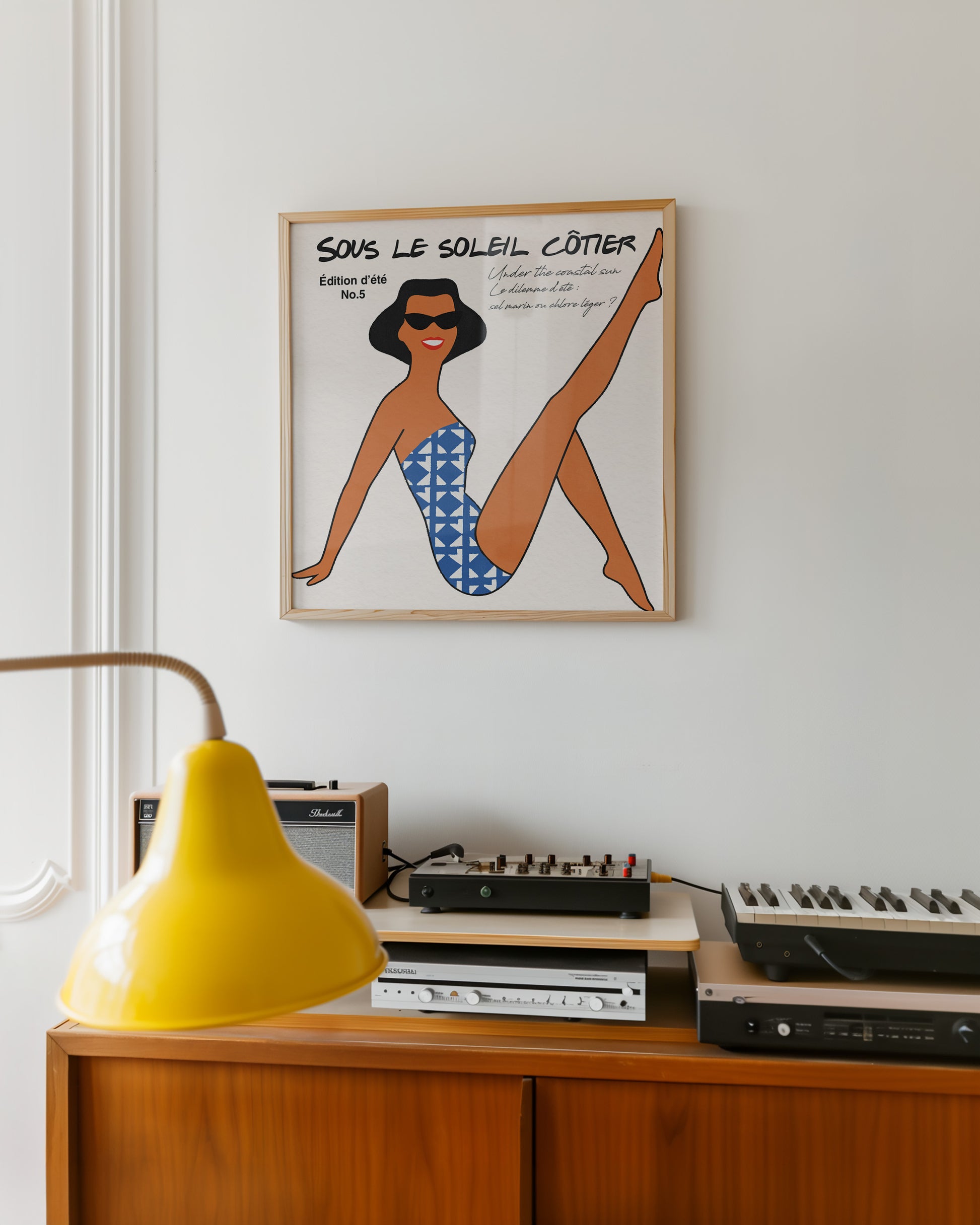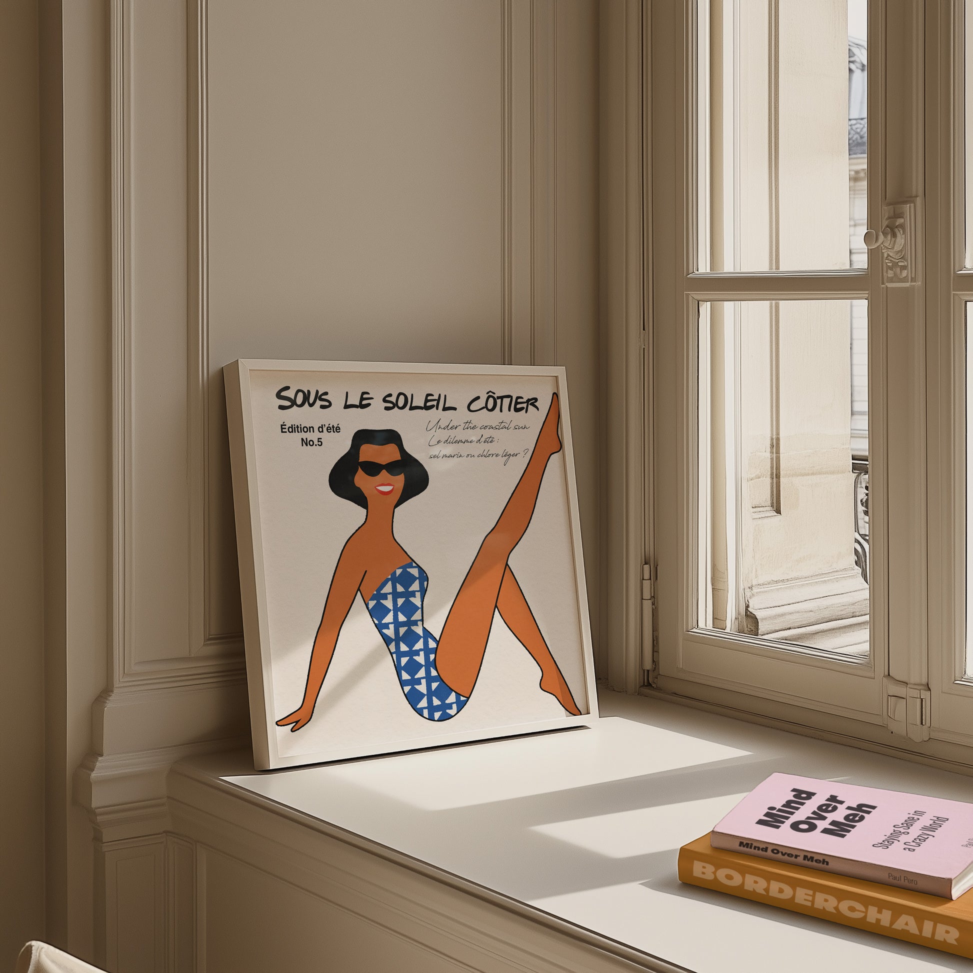Available in three different formats: digital download, printed poster and wooden framed poster, this charming print captures a distinctly French summer aesthetic, featuring a stylish woman in a strapless blue-and-white geometric swimsuit, striking a playful pose under the phrase “Sous le soleil côtier", which translates to "Under the coastal sun."